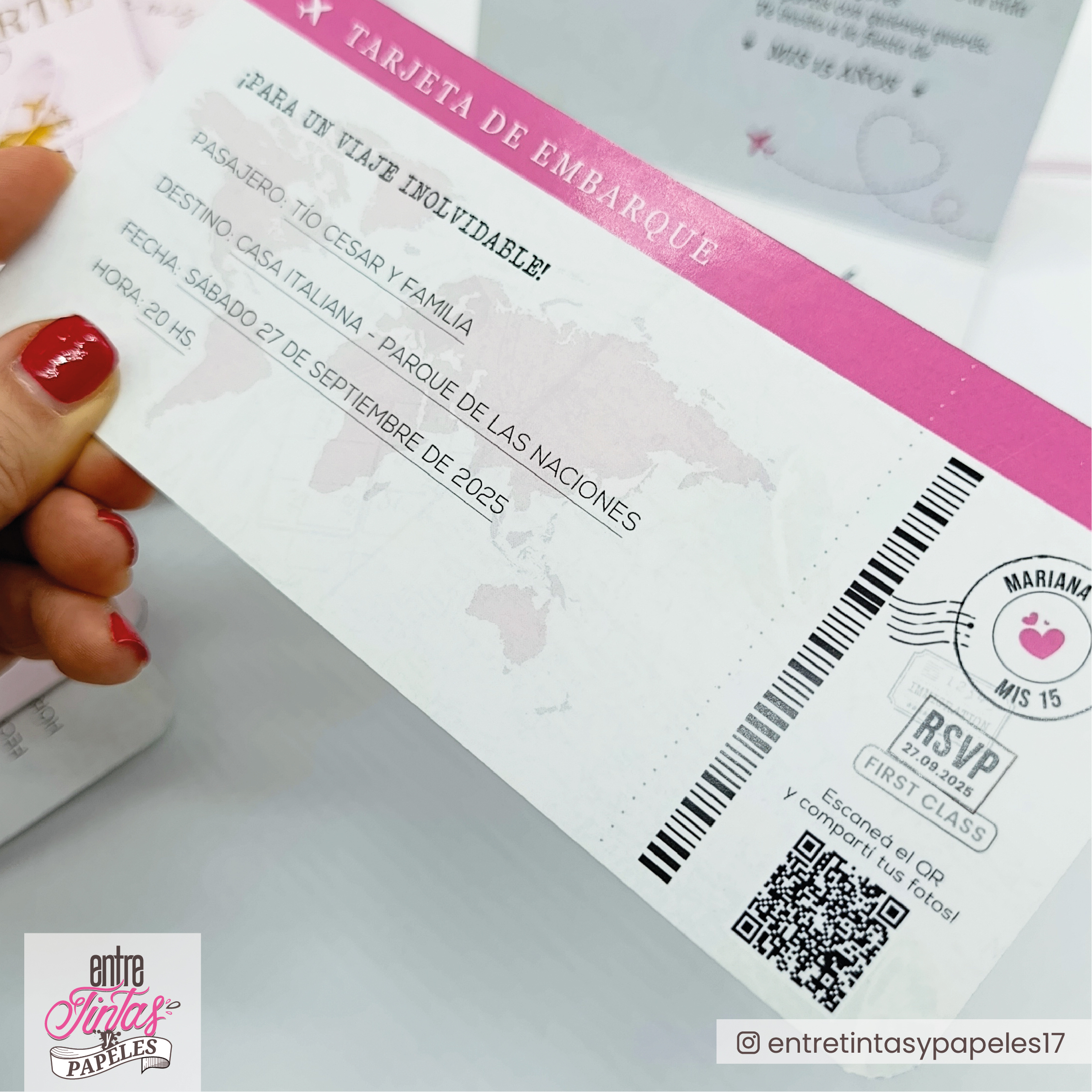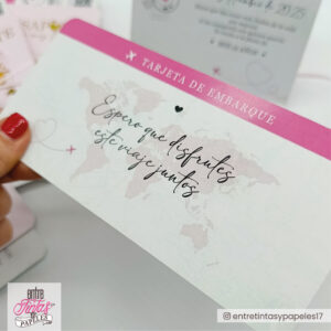 Cada invitación incluye un pasaporte con tapa rígida, con el exterior en color (sujeto a disponibilidad del proveedor) + impresión metalizada y en el interior impreso en papel ilustración de 300 gr. Además incluye un boleto de embarque de 17×8 cm bifaz y se cierra con cinta de raso de color, según el diseño final del pasaporte.
